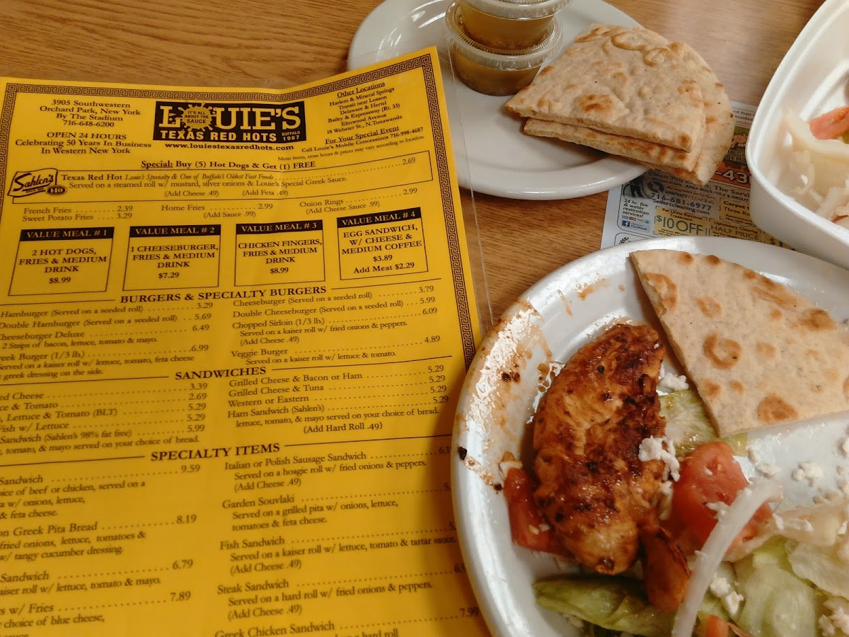 lettuce, tomatoes, white onions, green peppers, greek feta cheese, peperoncini, greek olives & louie's special dressing on the side